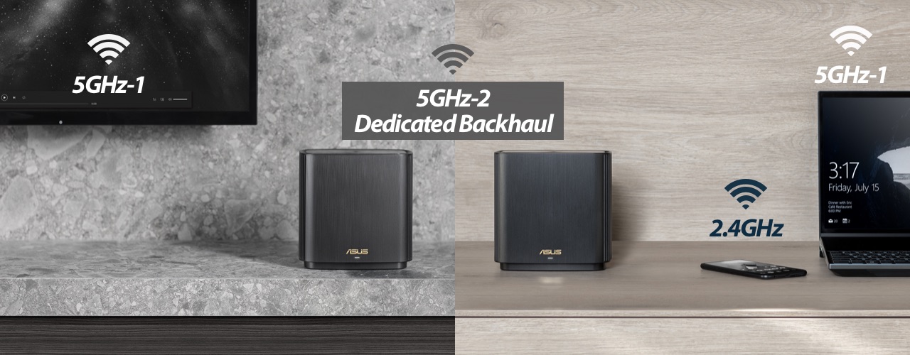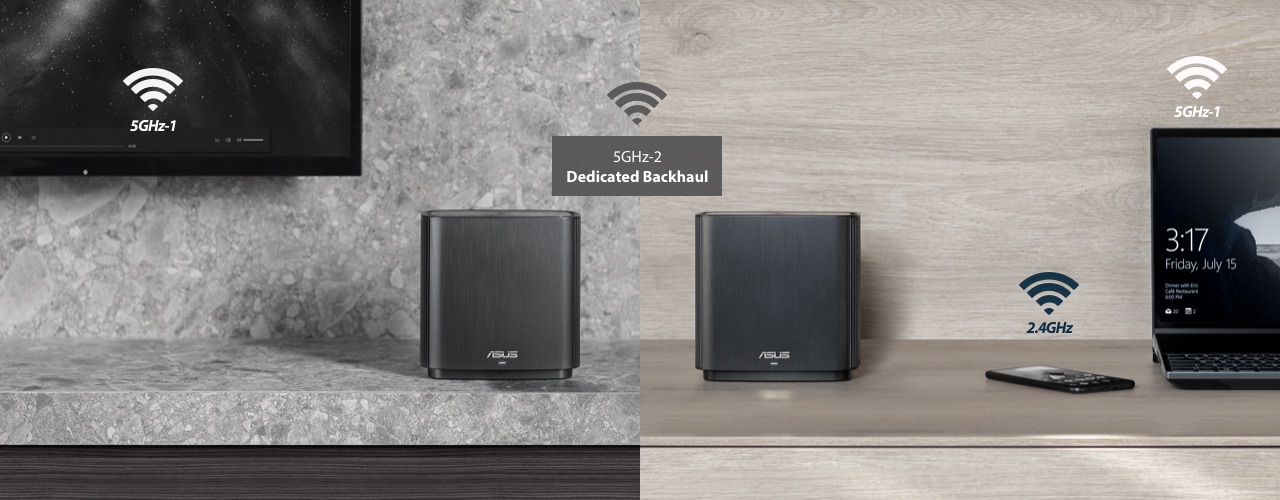 Unlike traditional dual-band mesh WiFi systems that sacrifice half of the total wireless bandwidth to the backhaul connection, ZenWiFi AC features a tri-band design with a full WiFi band for the backhaul, maximizing system performance and stability. With this upgraded design, you'll experience fast and stable WiFi, even when data transfers through multiple hubs to reach your device.
