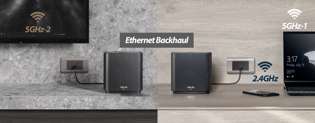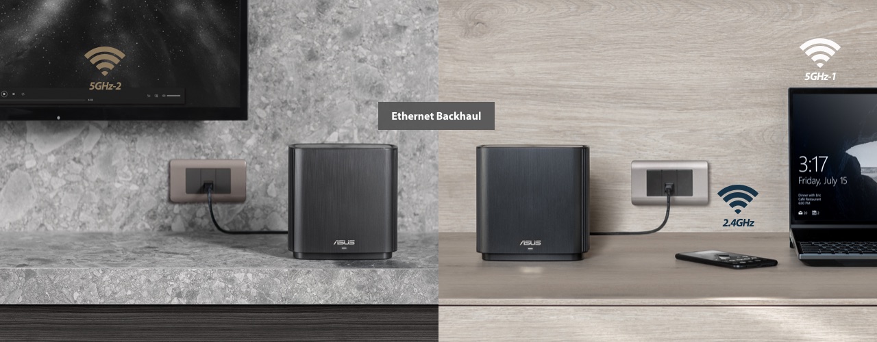 ZenWiFi AC allows flexible configuration of the backhaul connection. You can set the second 5GHz band as a dedicated or non-dedicated backhaul connection, enabling maximized backhaul speed or freeing up the fastest 5GHz band for connected devices. If you have Ethernet ports in your walls, you can also set ZenWiFi AC to use Ethernet backhaul, reserving all three WiFi bands for your wireless devices for even more stable and reliable networking.