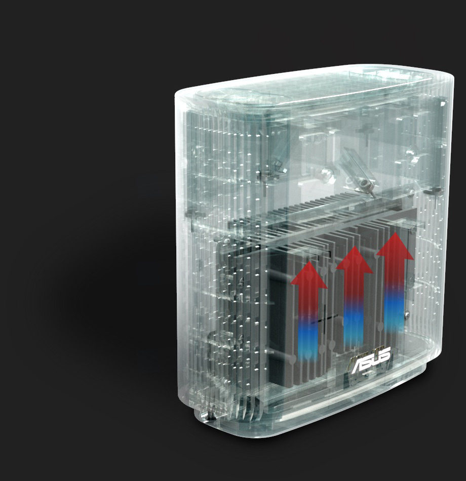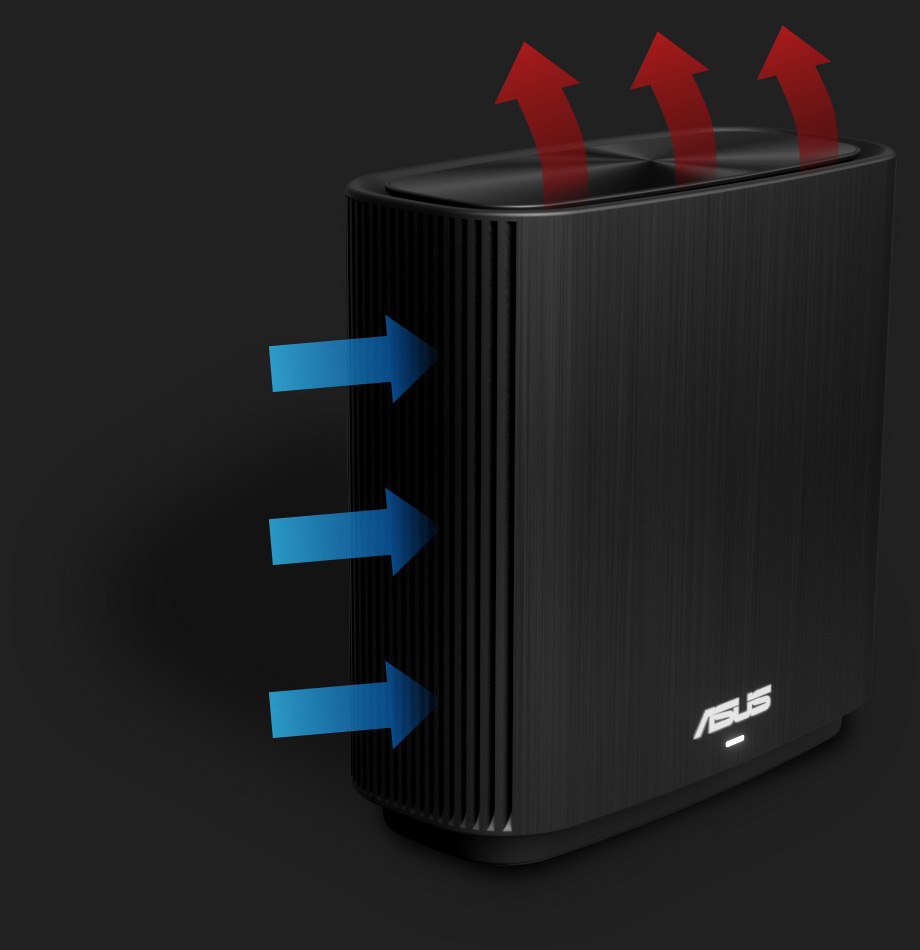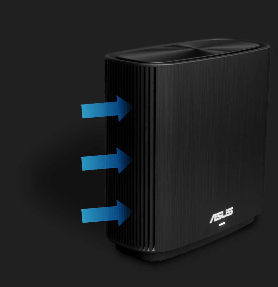 ZenWiFi AC features a quad-core CPU for ultimate processing power. Its vertical housing holds a specially designed antenna and circuit board that optimizes WiFi signal strength and provides better airflow, improving thermal performance for reliable operation.